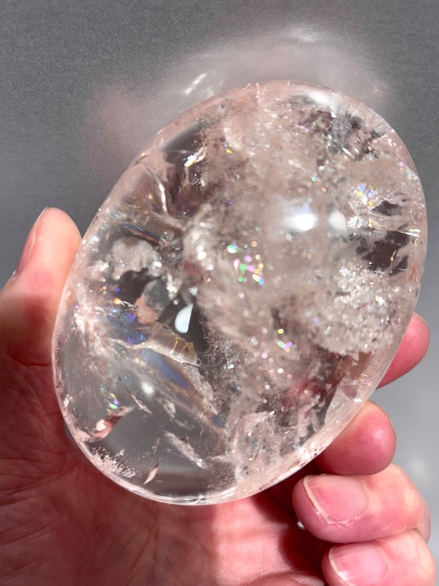 極上品質の水晶パームになります。 陽なエネルギー満載のパーム。 うるうるとした無色透明のパームから無数の花びらがマルチカラー状に輝きを放ちます。 また水のようにクリア品質。 瞳に心地よい、見ているとその空間が明るいエネルギーで包まれるようです。 大きめ、ボリュームのあるサイズ感* 水晶は浄化作用が最強のクリスタルと言われております* スフィアやフリーフォームを既にお持ちの方やヒーラーさんにもとてもおすすめのパームです。 空間浄化やお守りとして・持ち歩き用の相棒としてもぴったりのアイテム。 職場のデスクの片隅に置いて癒されながらお仕事するのもオススメです* 〜コメント〜 雑味や不純物が少ない極上品質☆ 花びらアイリス一つ一つがマルチカラー状に輝きを放つ大変華やかで美しくハッピーオーラ全開のパームさんです。 手元にあるだけで陽のチカラが伝わってきそうです。 なんだか最近疲れていると感じる方や新しい環境、新しい事を始める時に力強い味方になってくれることでしょう* 私自身がこの美しい透明感と形状に心惹かれ直感的に必要な方へお繋ぎしたいと強く感じました。 品質にこだわるオーナーが納得のいく品質のものを手にすることができたことをうれしく思っております。 写真・動画で見るよりも実物は数倍美しく手にした方は驚くことでしょう。 オーナー自身が個人コレクションにしたいと思うほどの驚くほど美しい水晶をお届けいたします。 動画はこちら 商品番号bb0166 ■ カラー/サイズ/バリエーション - カラー:無色透明 ■ 素材/製造国 - 素材: 天然水晶 ■ お手入れ/取り扱い注意事項 - 直射日光の当たる場所での保管は避けてください。 ■ 発送・注文に関する情報や注意事項 - 在庫がある場合、通常5営業日以内に発送いたします。 - 商品に多少の個体差があることをご理解の上ご購入ください。 ■ その他の情報や注意事項 - 天然石の特性上、クラックや内包物が見られることがありますが、これは自然の証です。品質に問題はありませんので安心してお求めください。 ‐ 撮影環境、光加減、お手持ちのスマホやパソコン環境により実物と写真および動画は全く同じ色合いを再現することはできません。 ‐発送後に郵送中の破損によるイレギュラーな事例などを除き、注文間違いやイメージ違いなどお客様都合による返金・返品対応はいたしかねますのでご注意ください。 ご質問がある場合は、ショップのお問い合わせからお気軽にご連絡ください。 あなたの特別な相棒として、素晴らし水晶をぜひお迎えください。