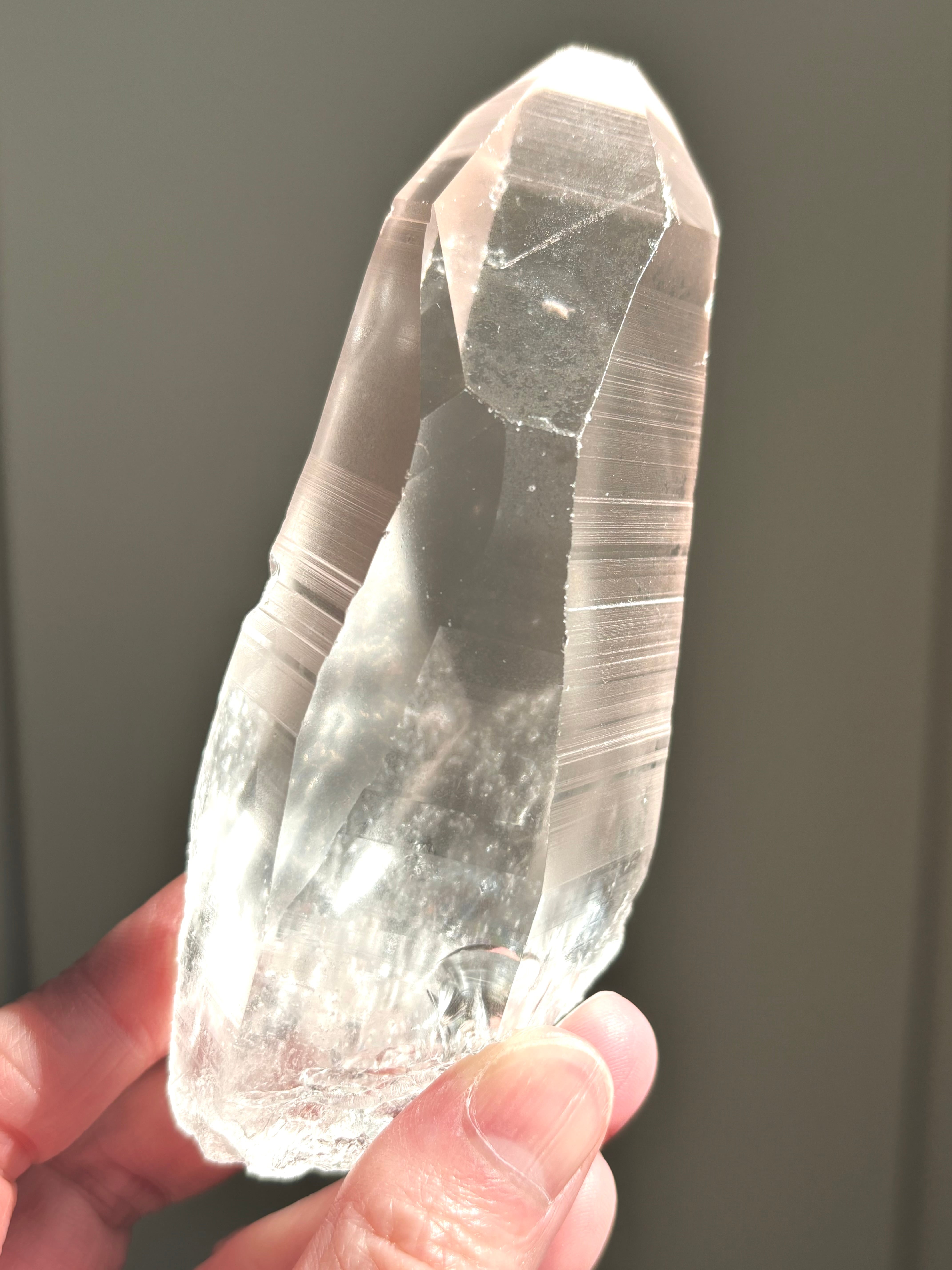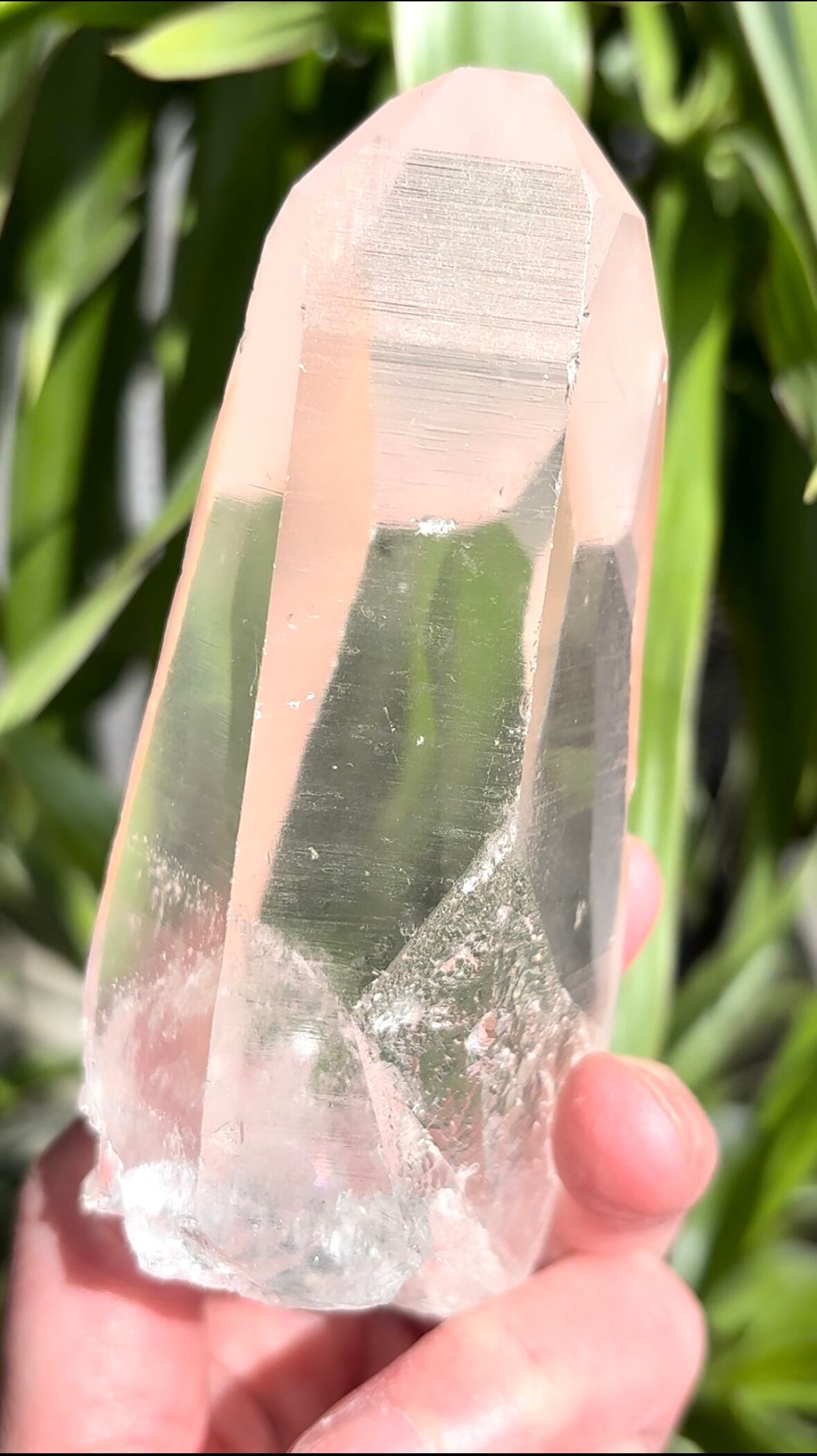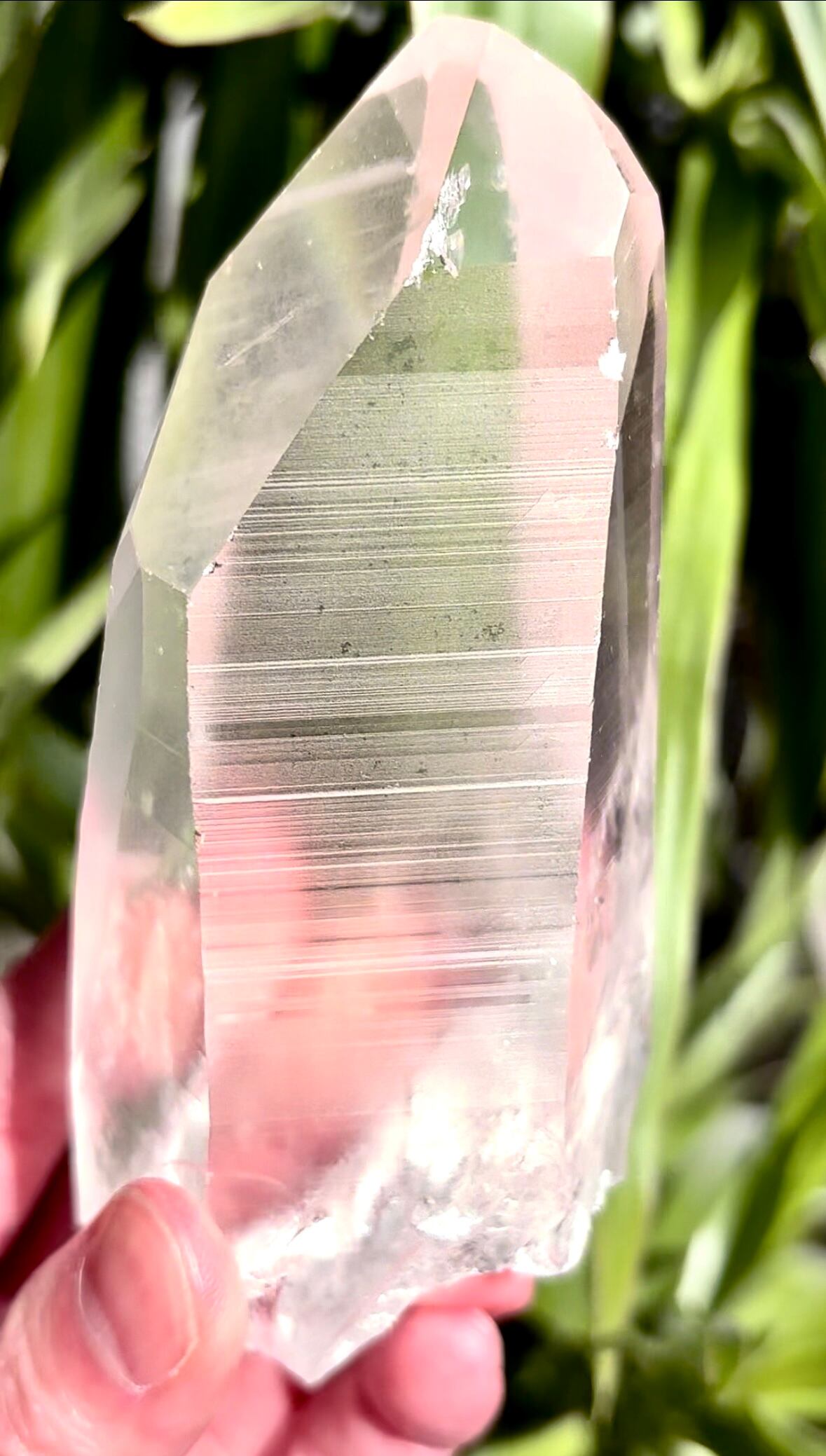 ストロベリーのような淡いピンクカラーのこちらのレムリアン クォーツ クリスタルは、とても透明度が高く側面にはレムリアンリッジが細かく刻まれています。