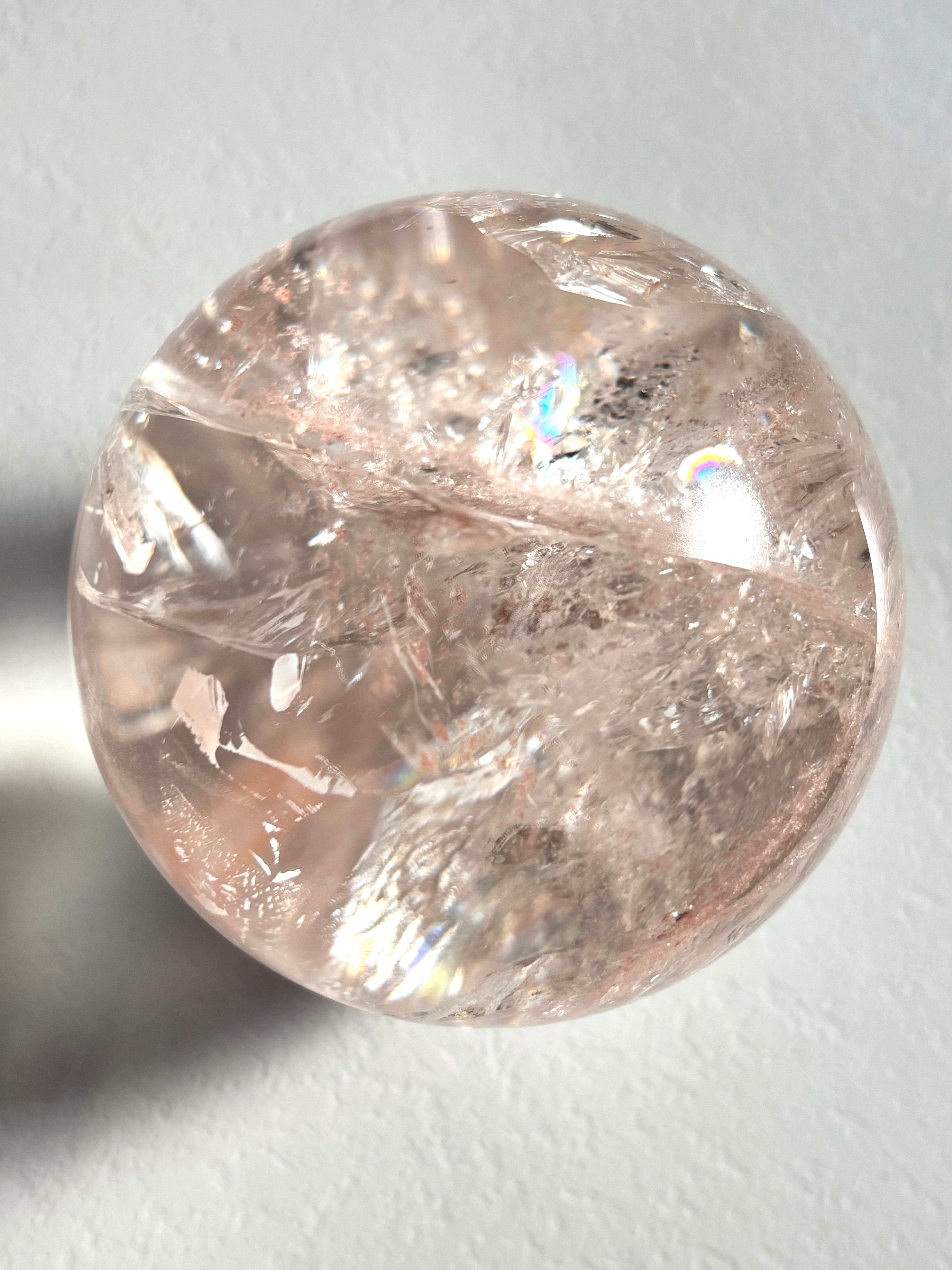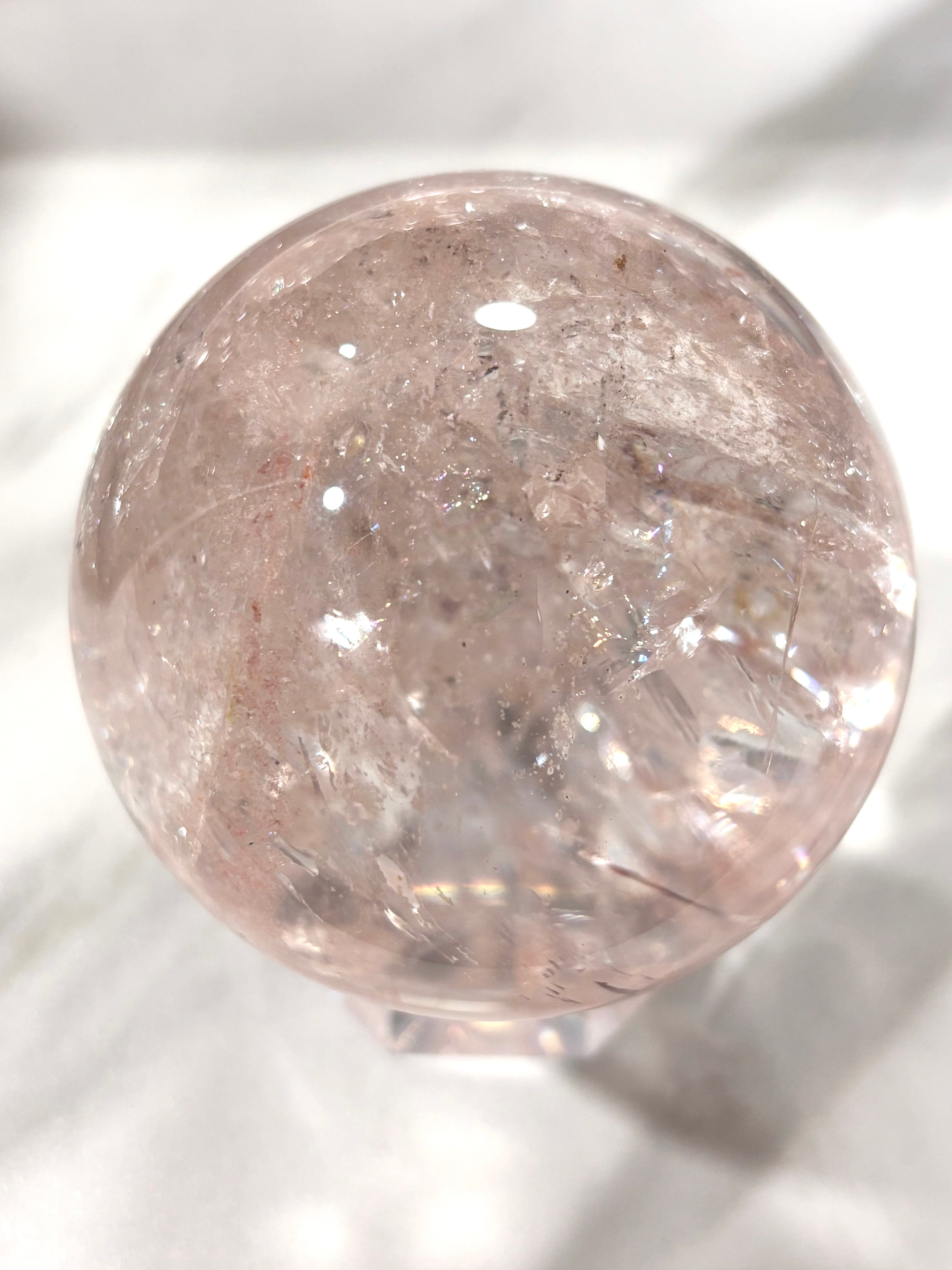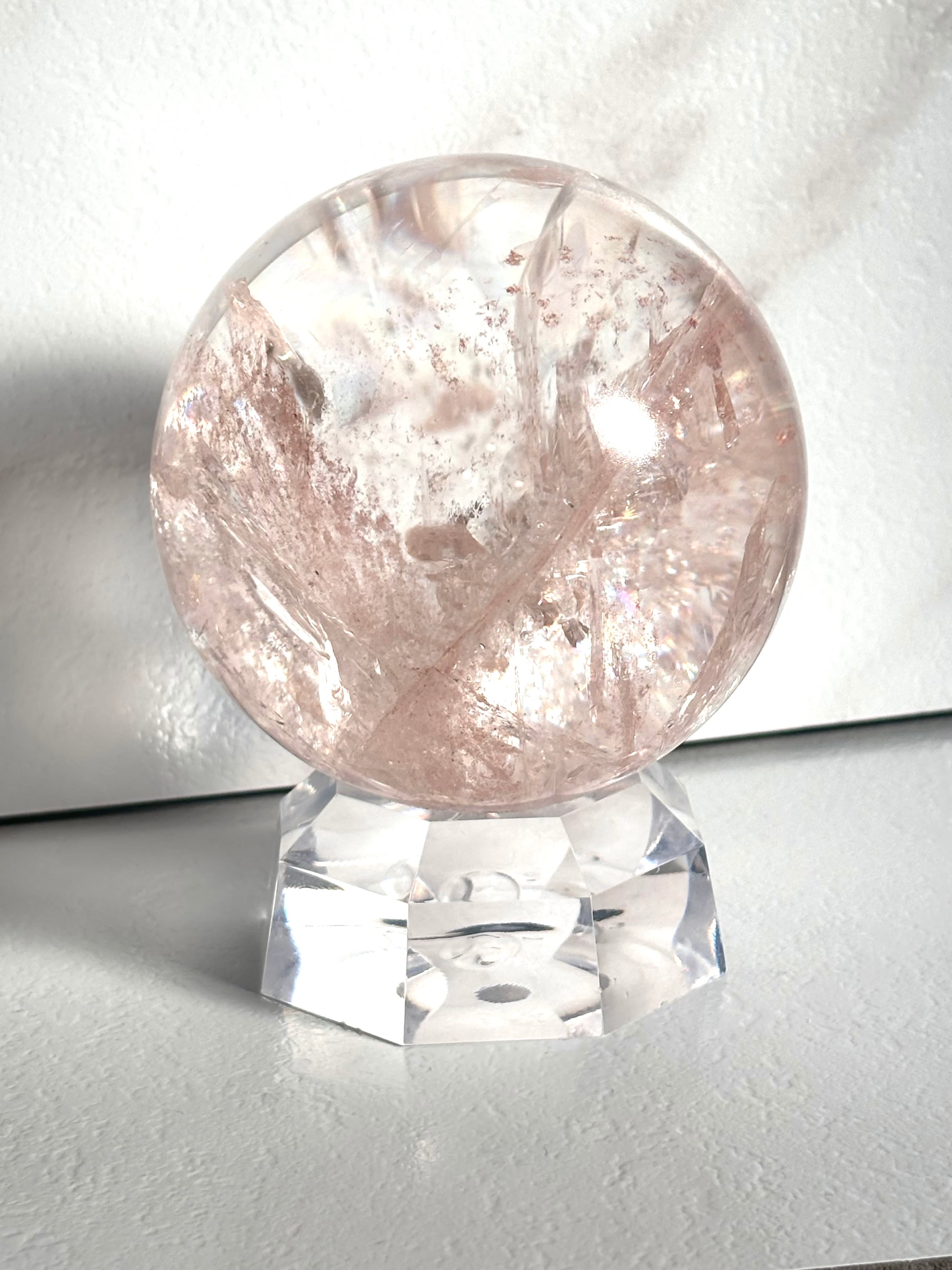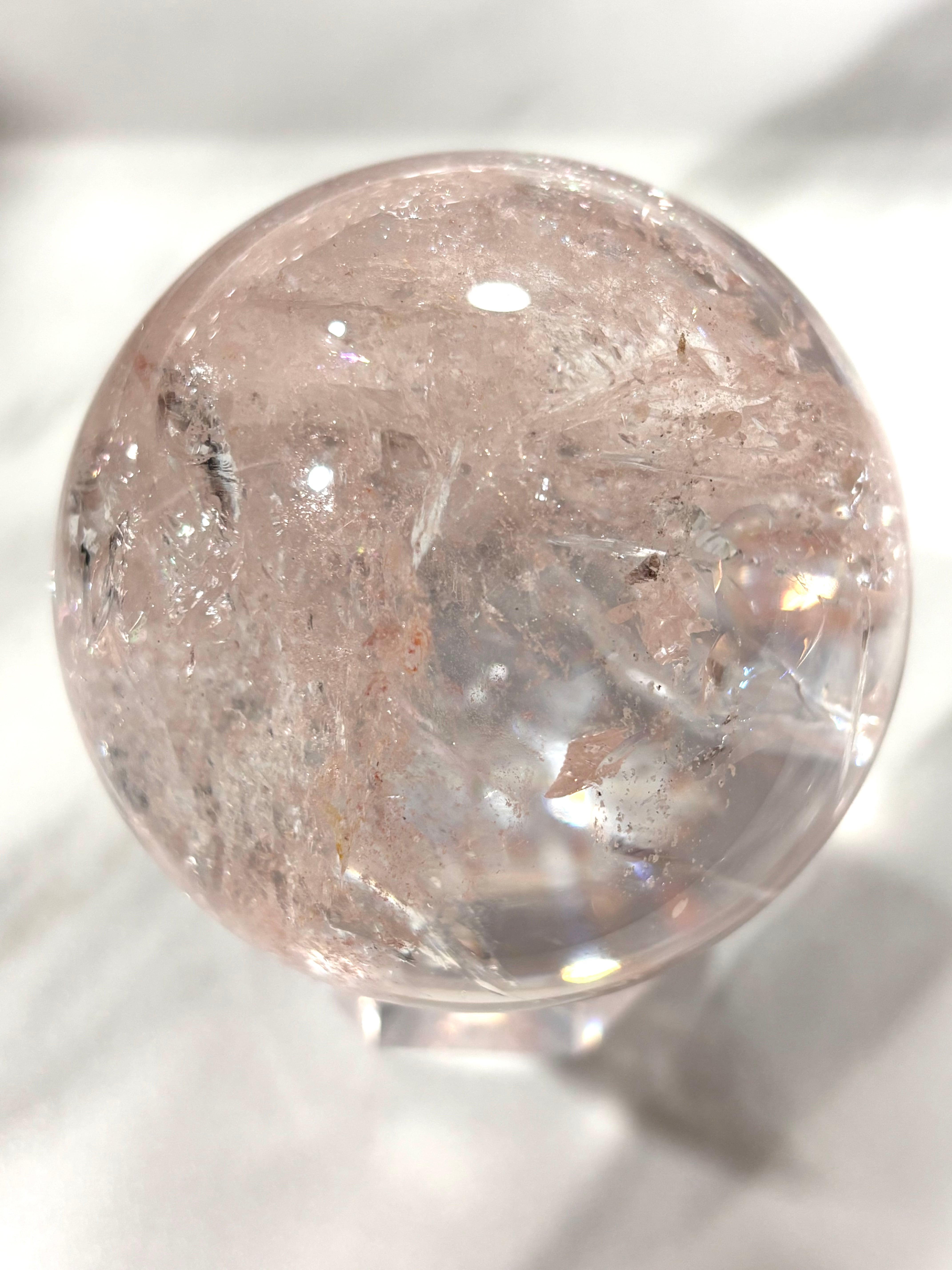 ピンクの色合いが濃いめ・チラチラと繊細に輝く虹が特徴のまるで水のようにクリア品質なスフィア。