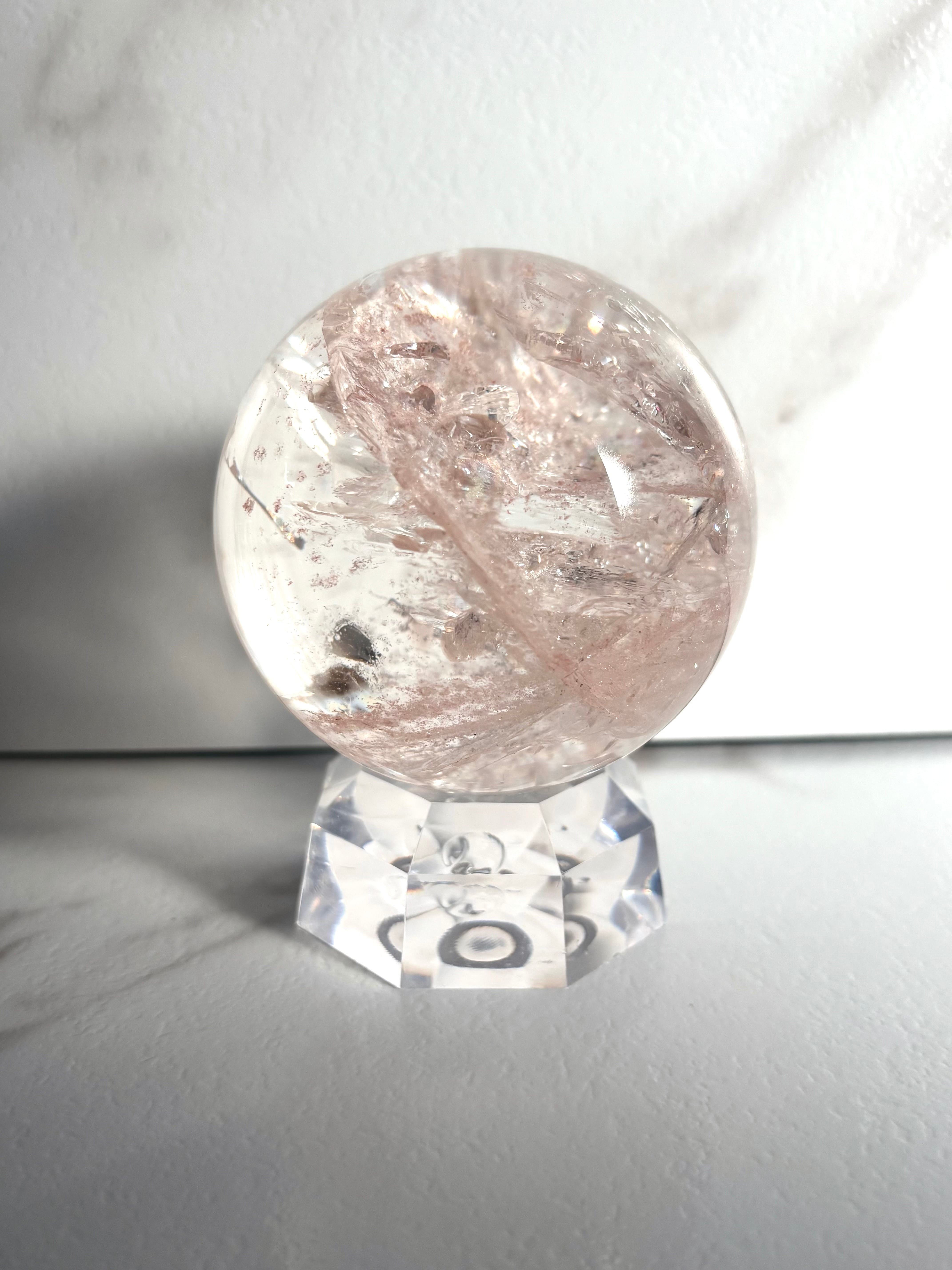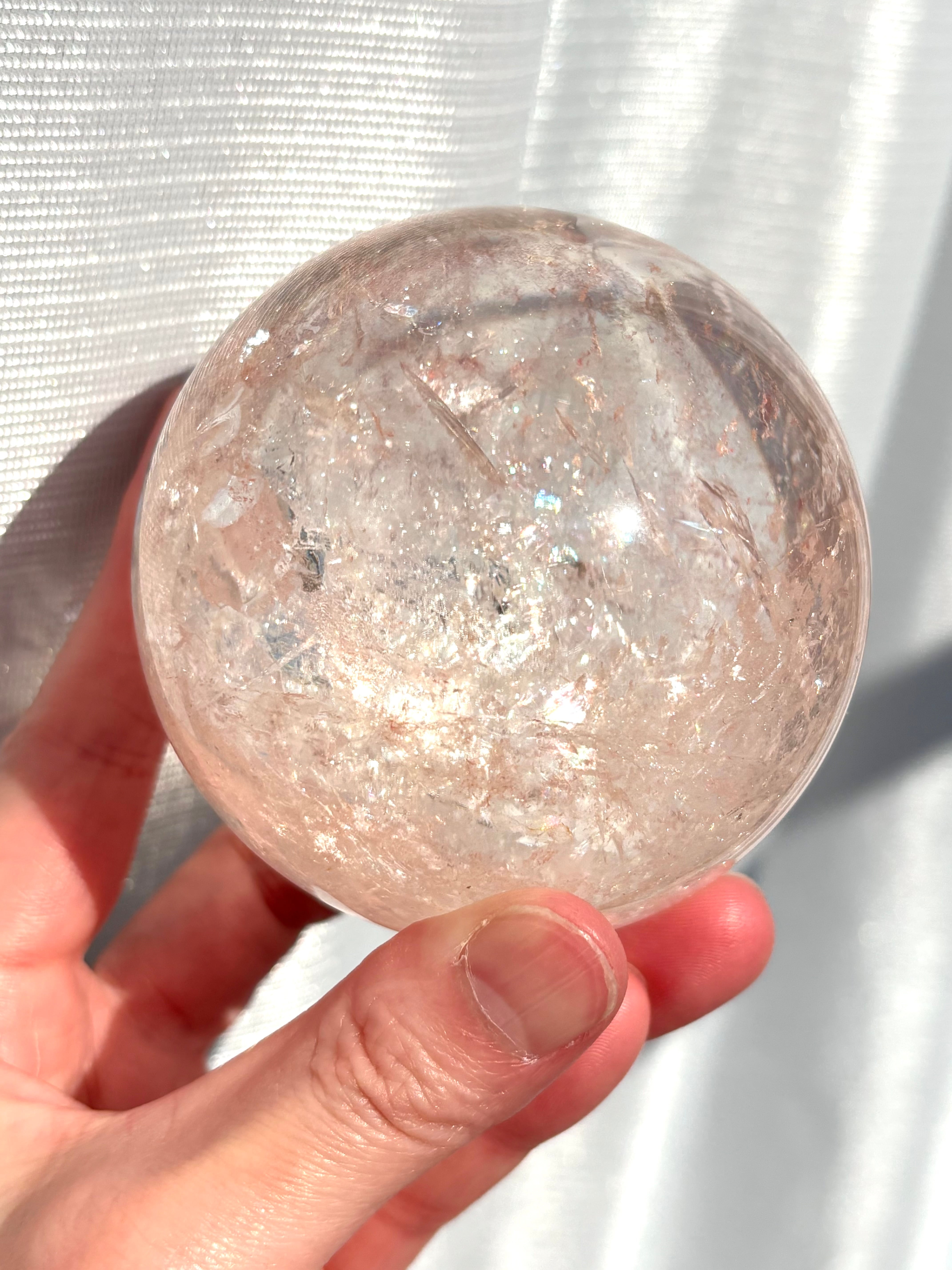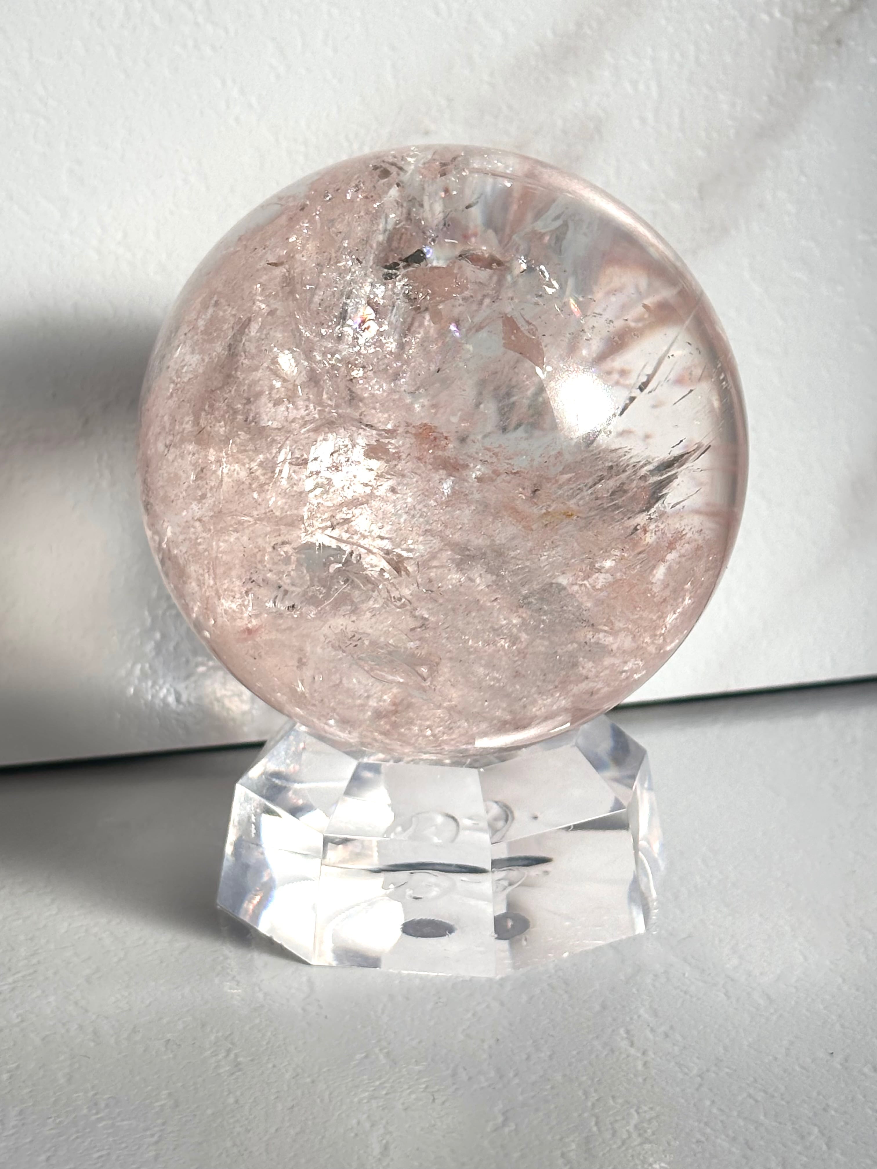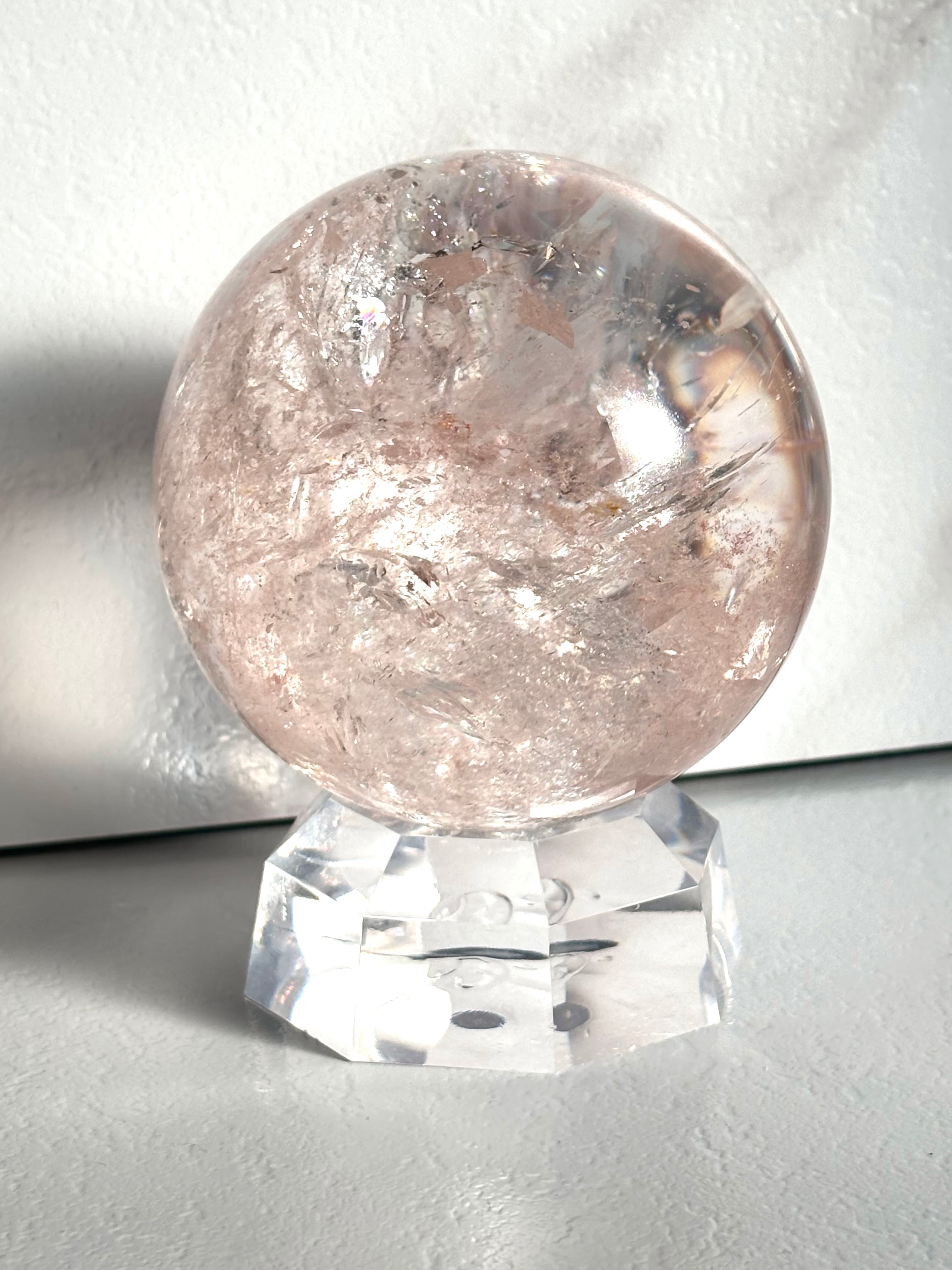 ピンクの色合いが濃いめ・チラチラと繊細に輝く虹が特徴のまるで水のようにクリア品質なスフィア。