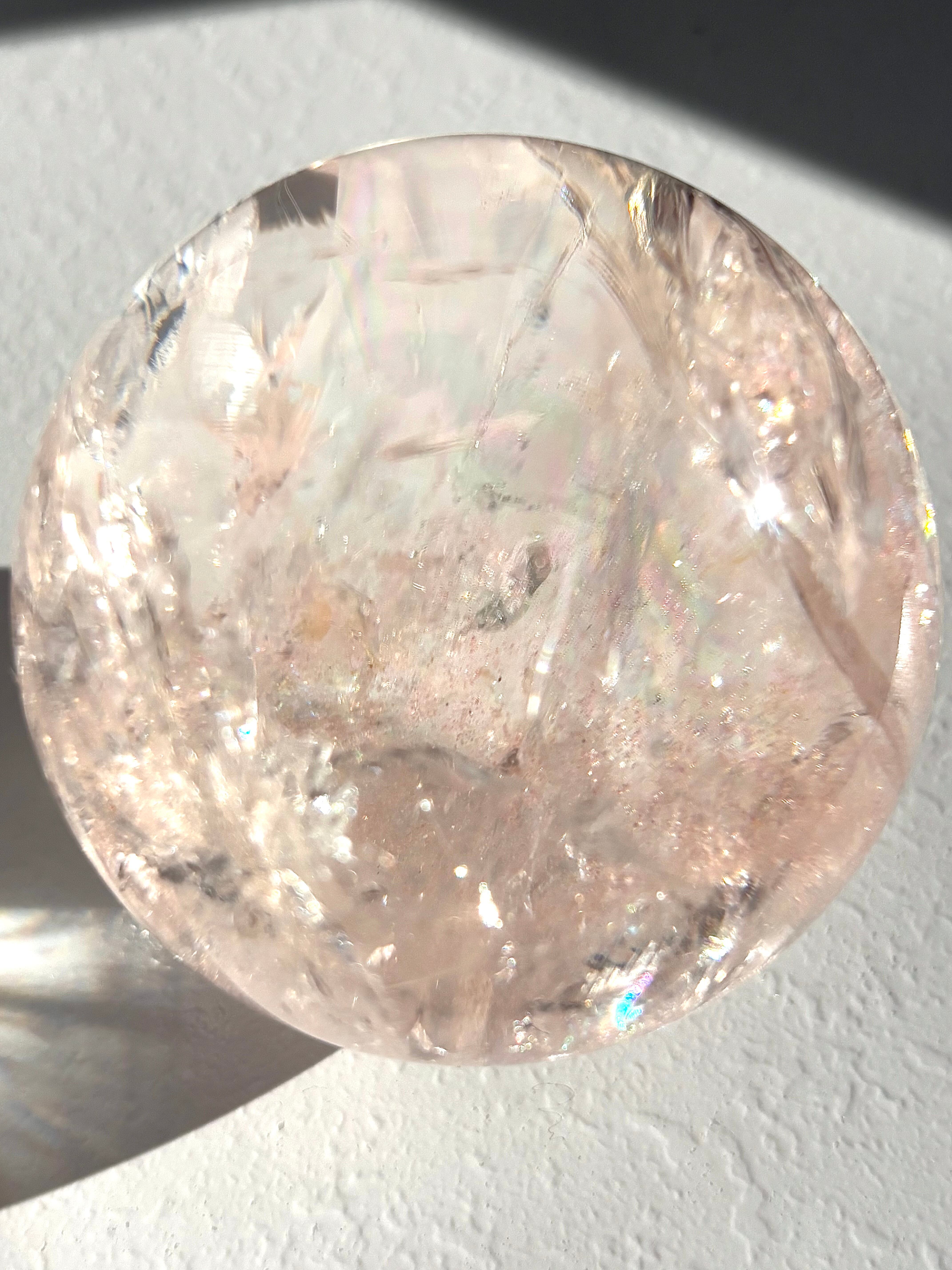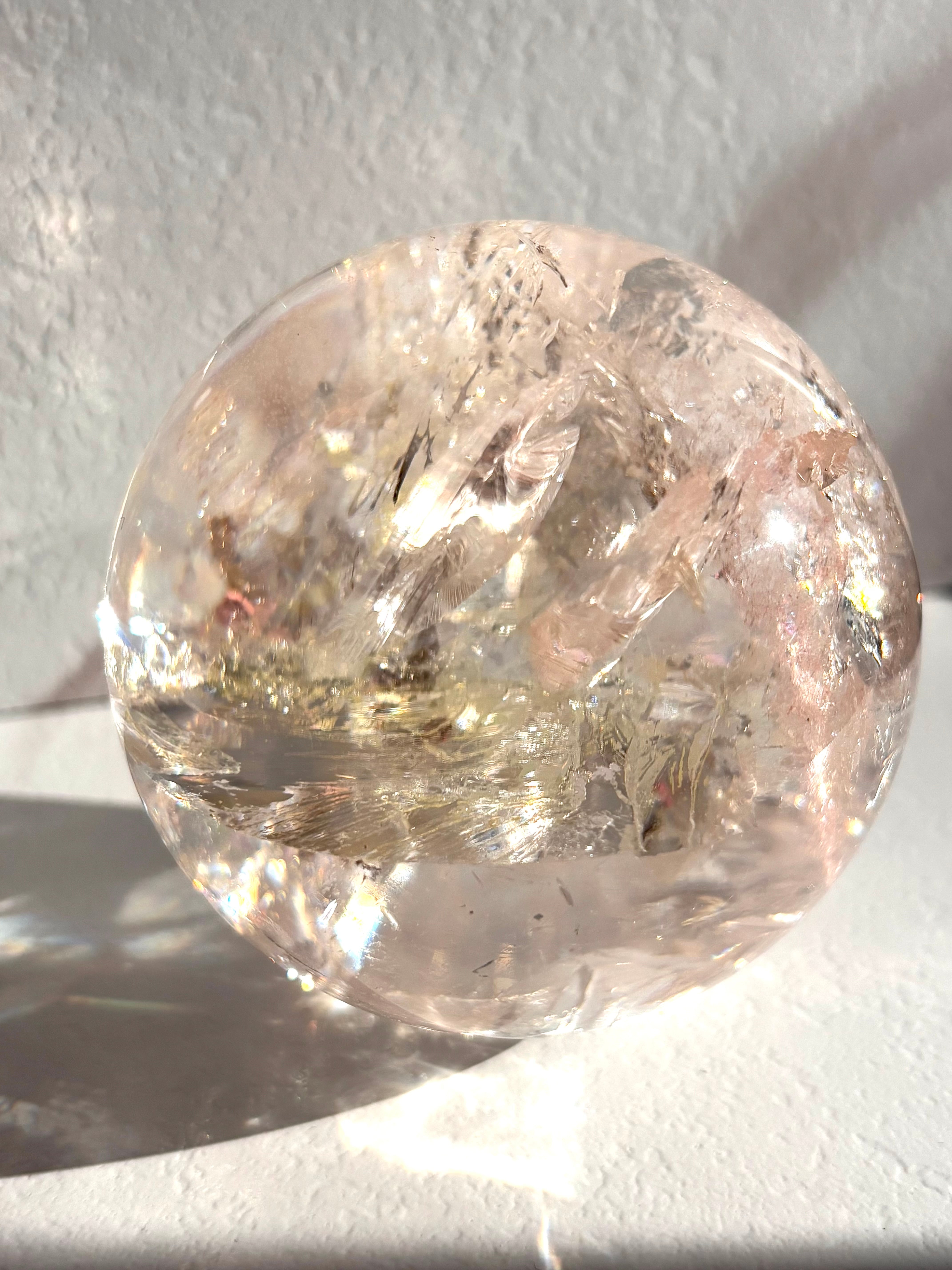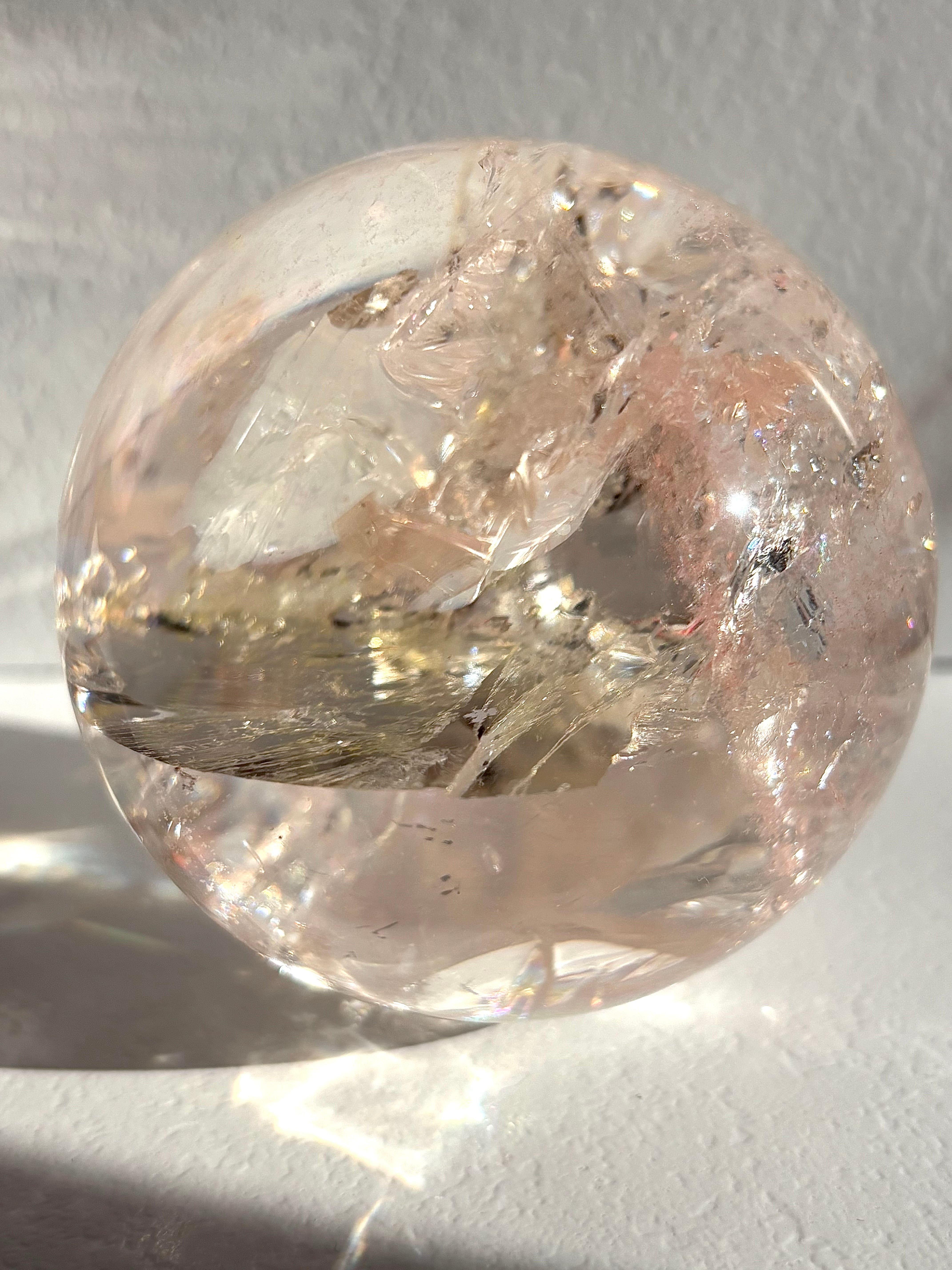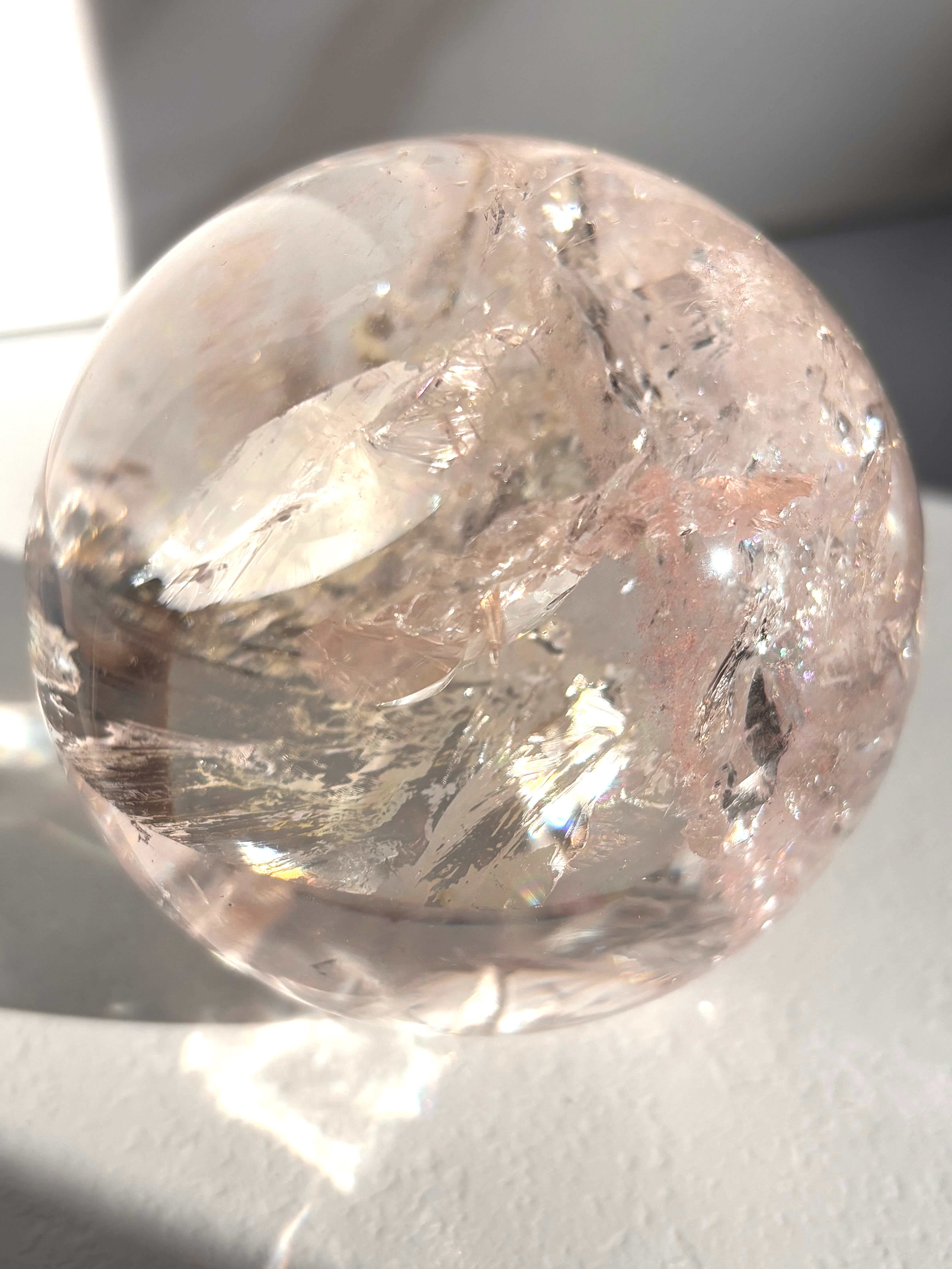 ピンククォーツなのですが陽の光を浴びるとピンクとレモンイエローに発光するマルチカラーな美しい球体。