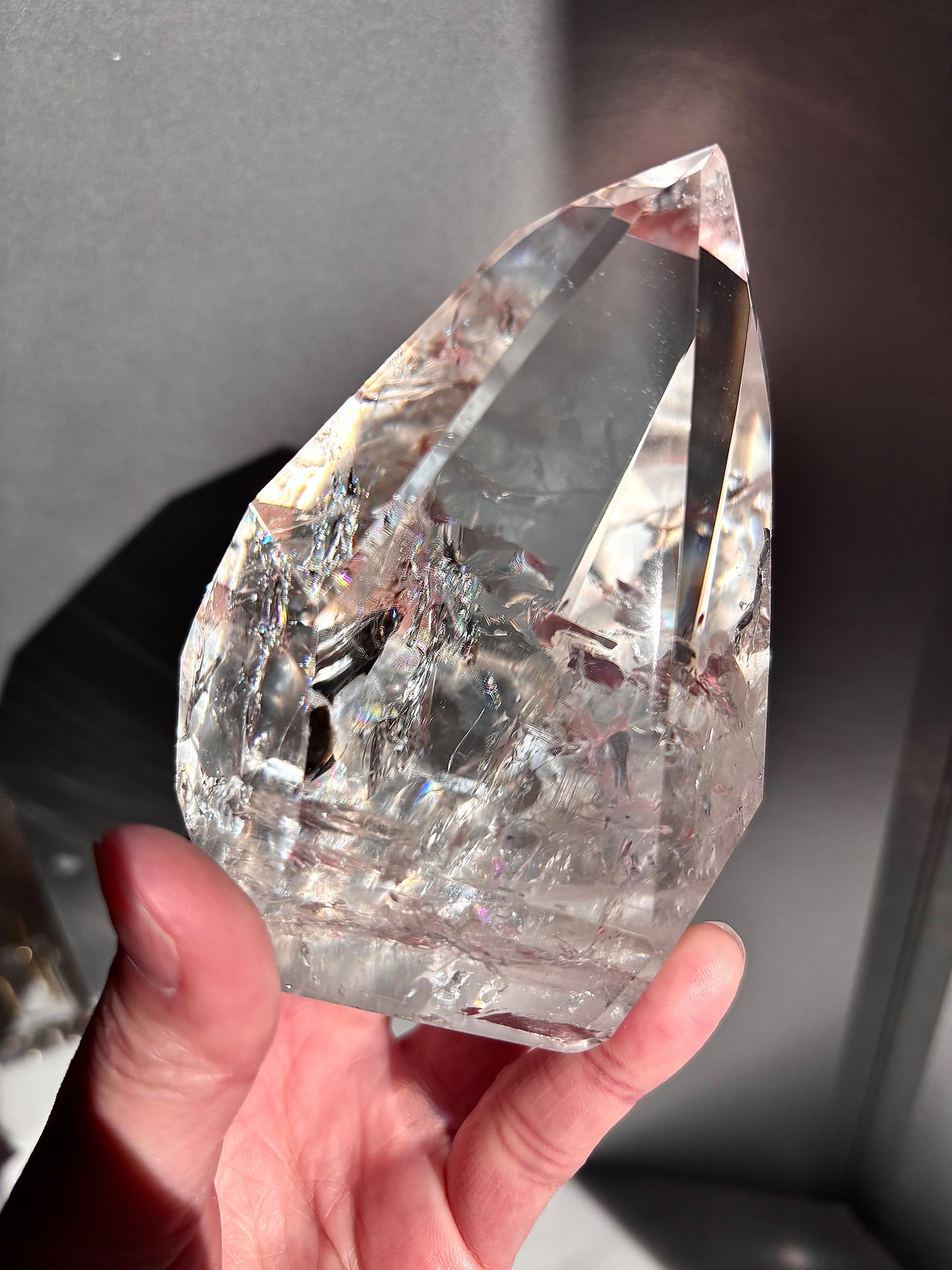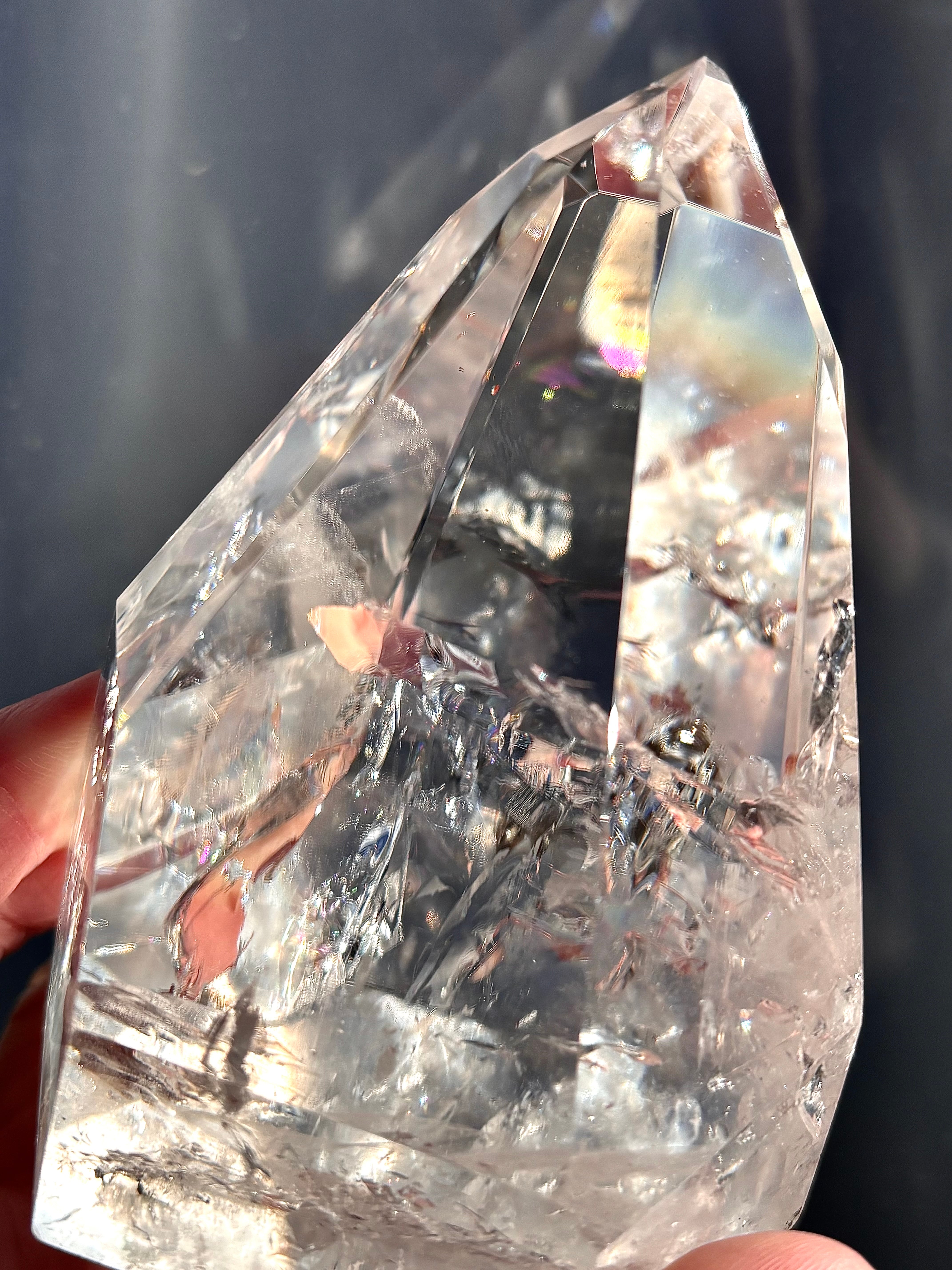 うるうるとした質感、ポイントの下部から湧き出てくるようなクラックの中にレインボーじゅわ〜っと浮かんでいるような幻想的な個体。