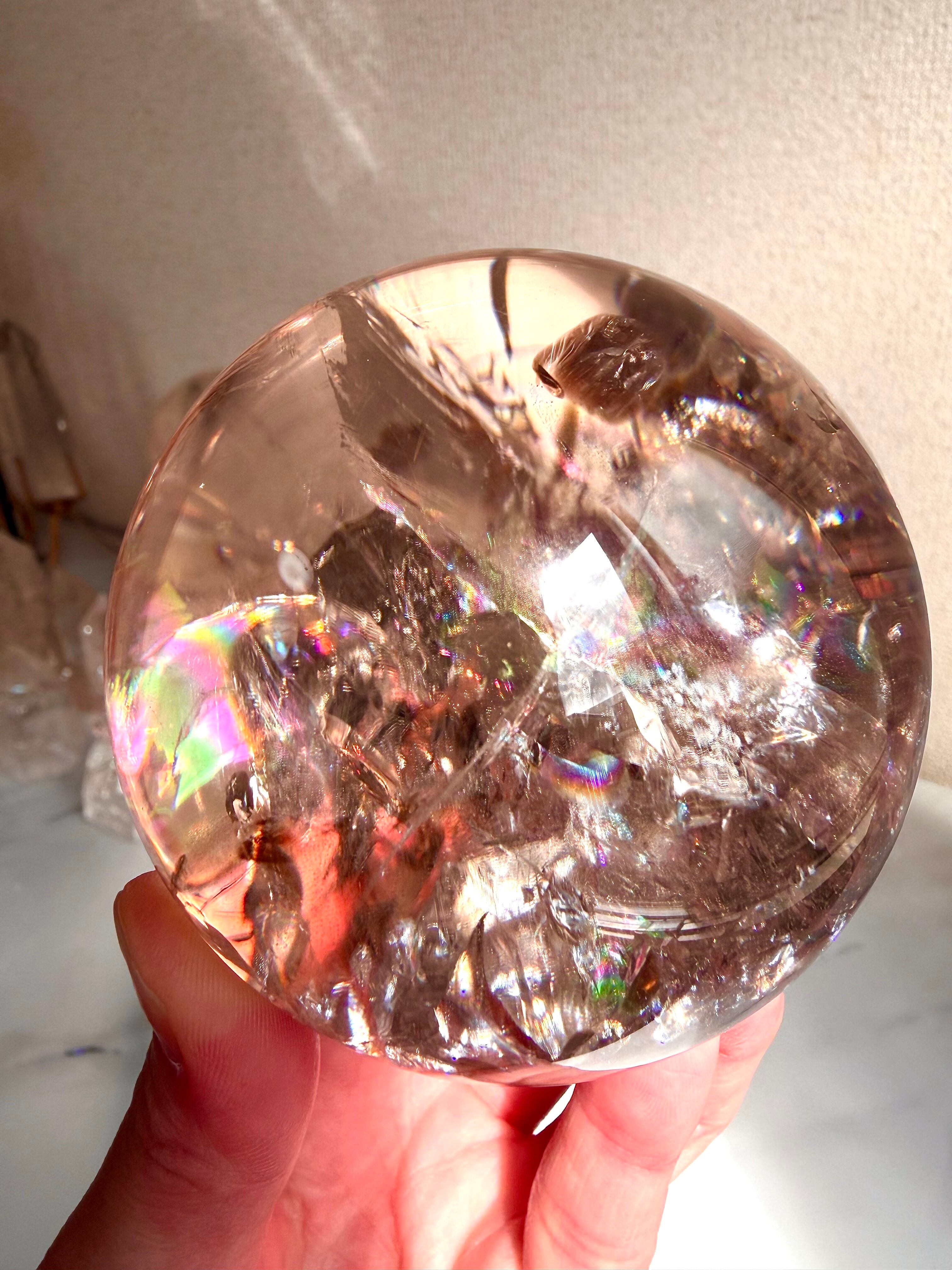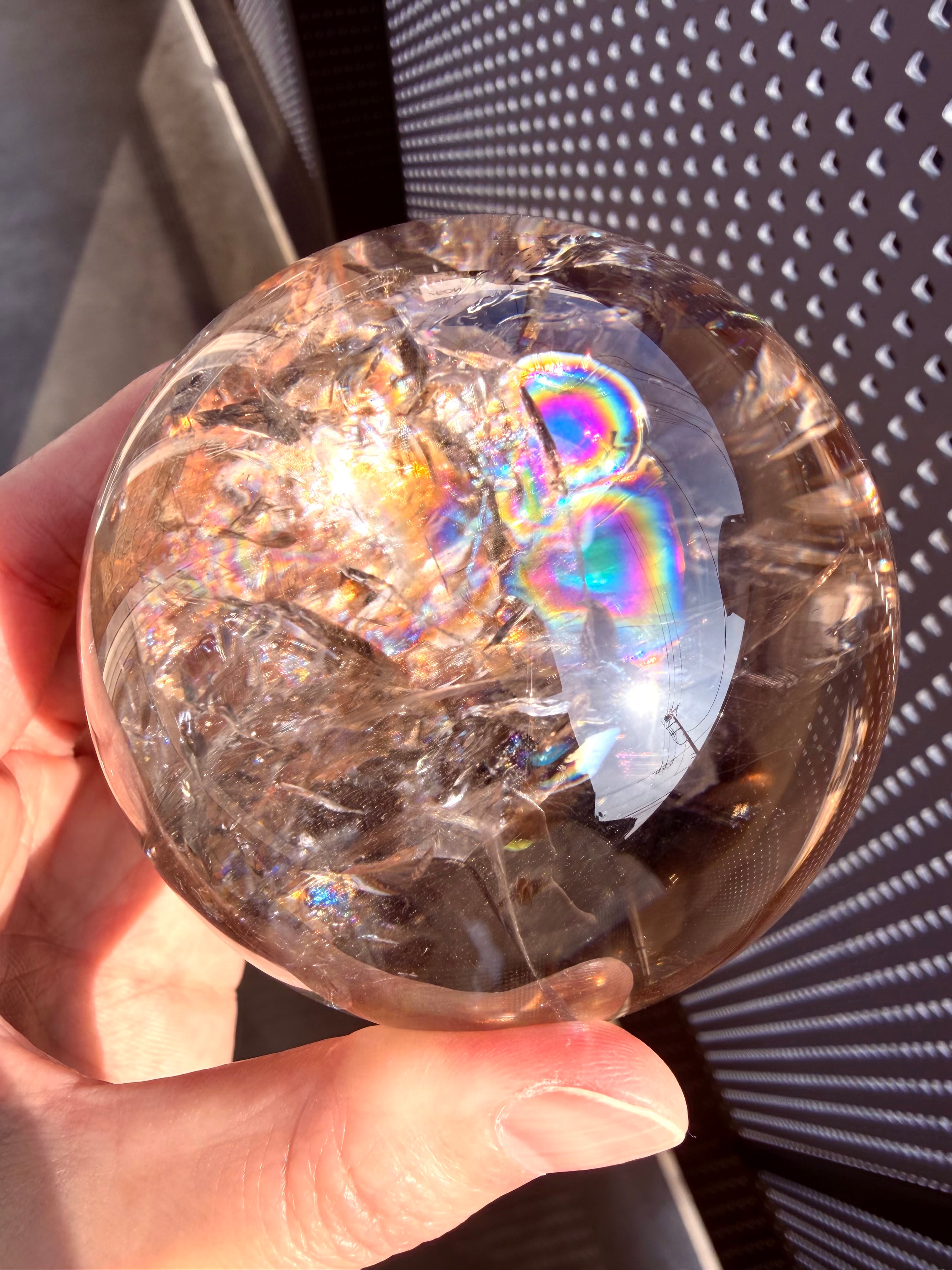 スモーキークォーツの美しさを存分に味わえるスフィアさん、この大きさで透明度が高くきらめくレインボーのスモーキークォーツは希少です☆