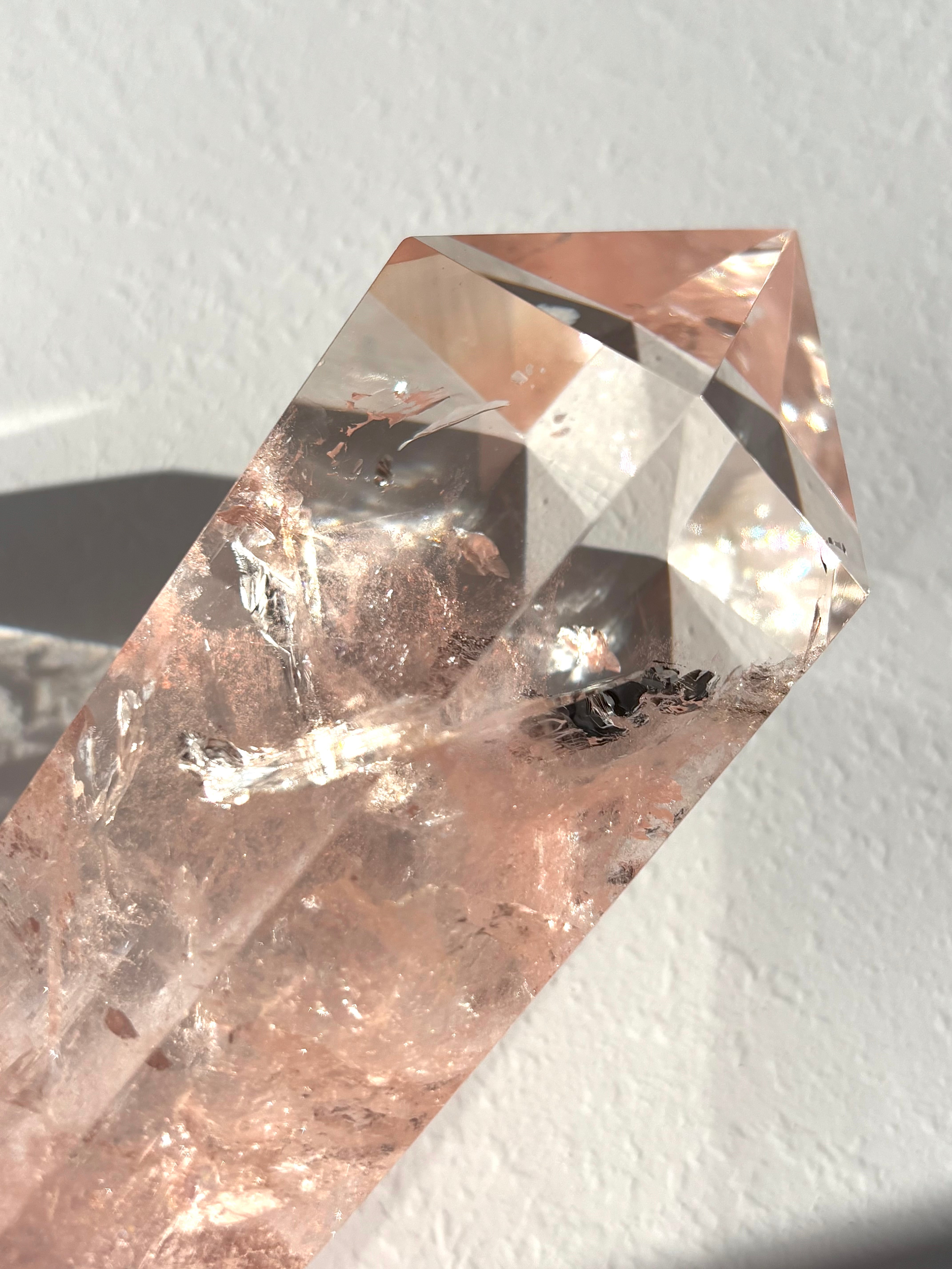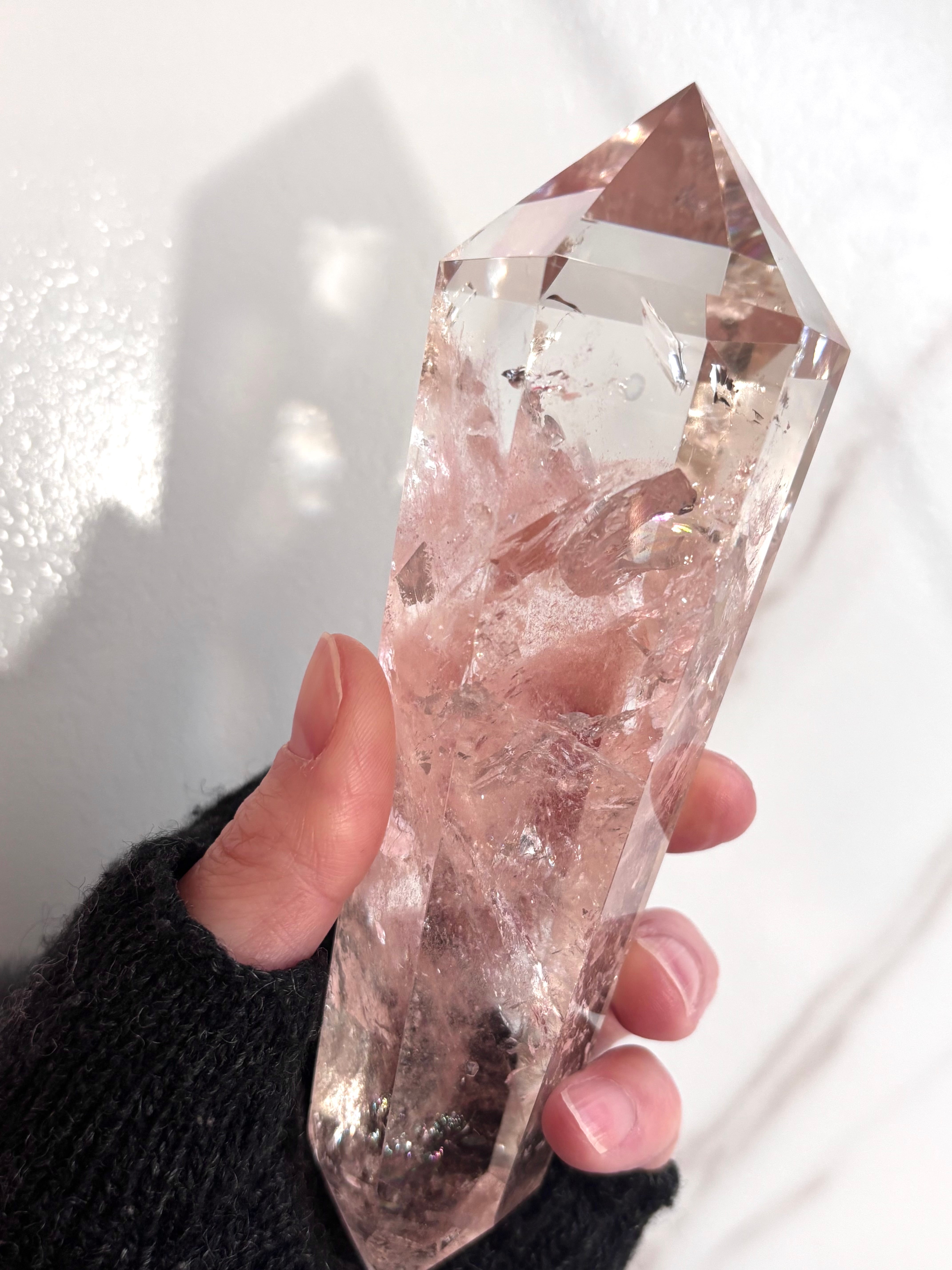 全体がピンクカラーに染まったフォルムが魅力、素晴らしい透明度と虹が確認できる美しいピンククォーツポイント*